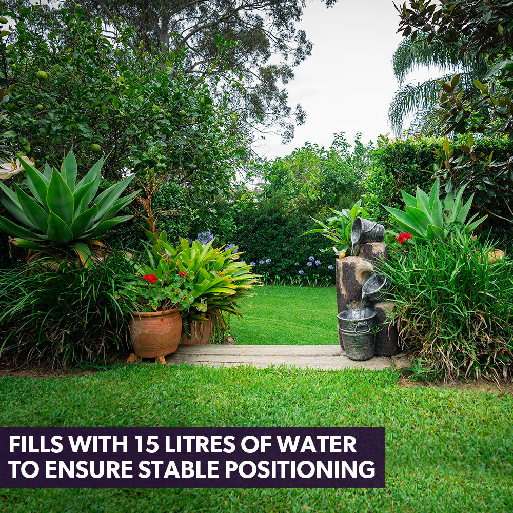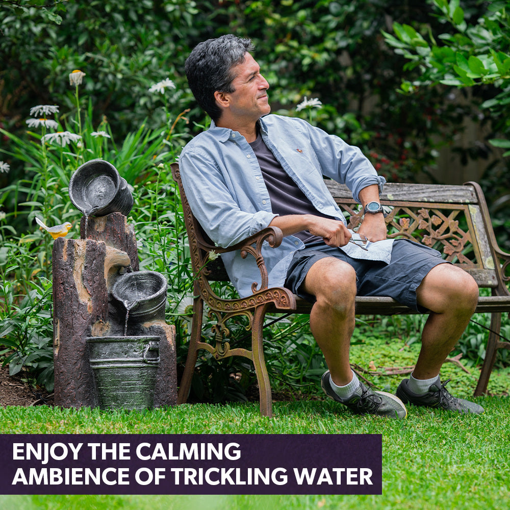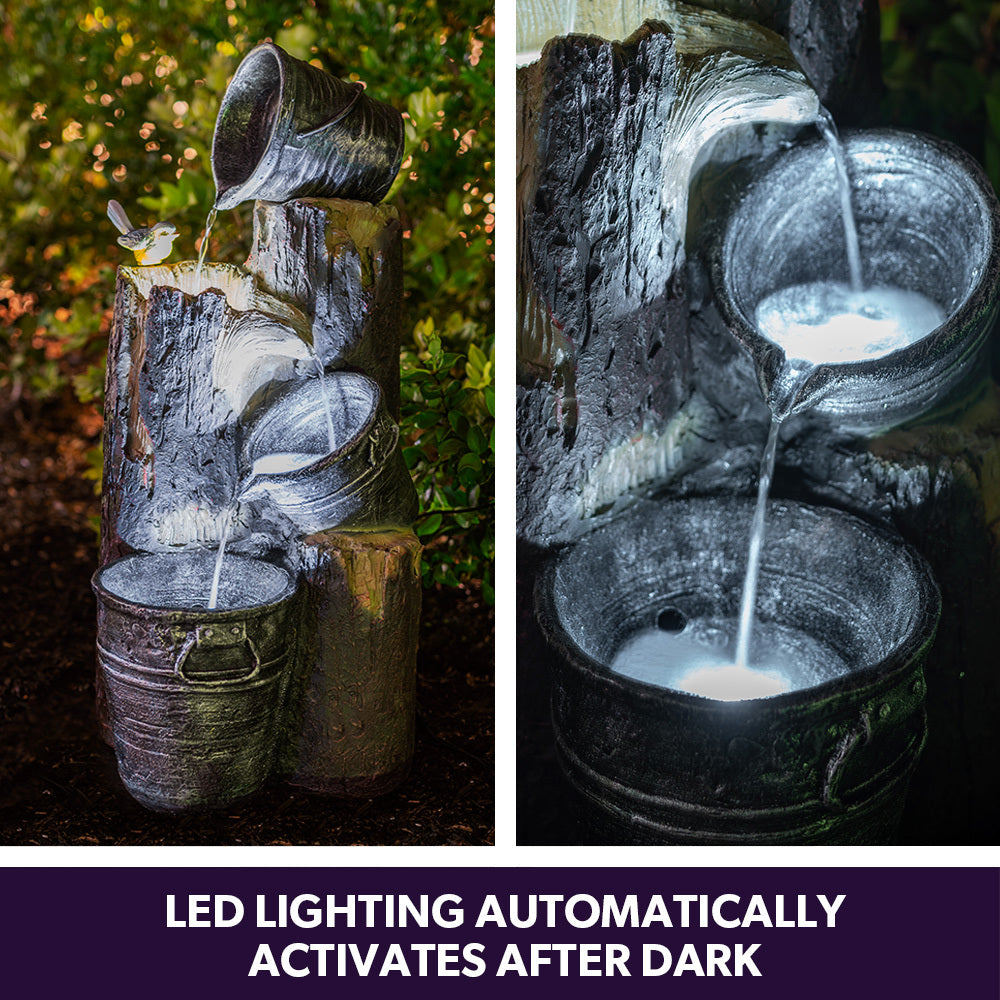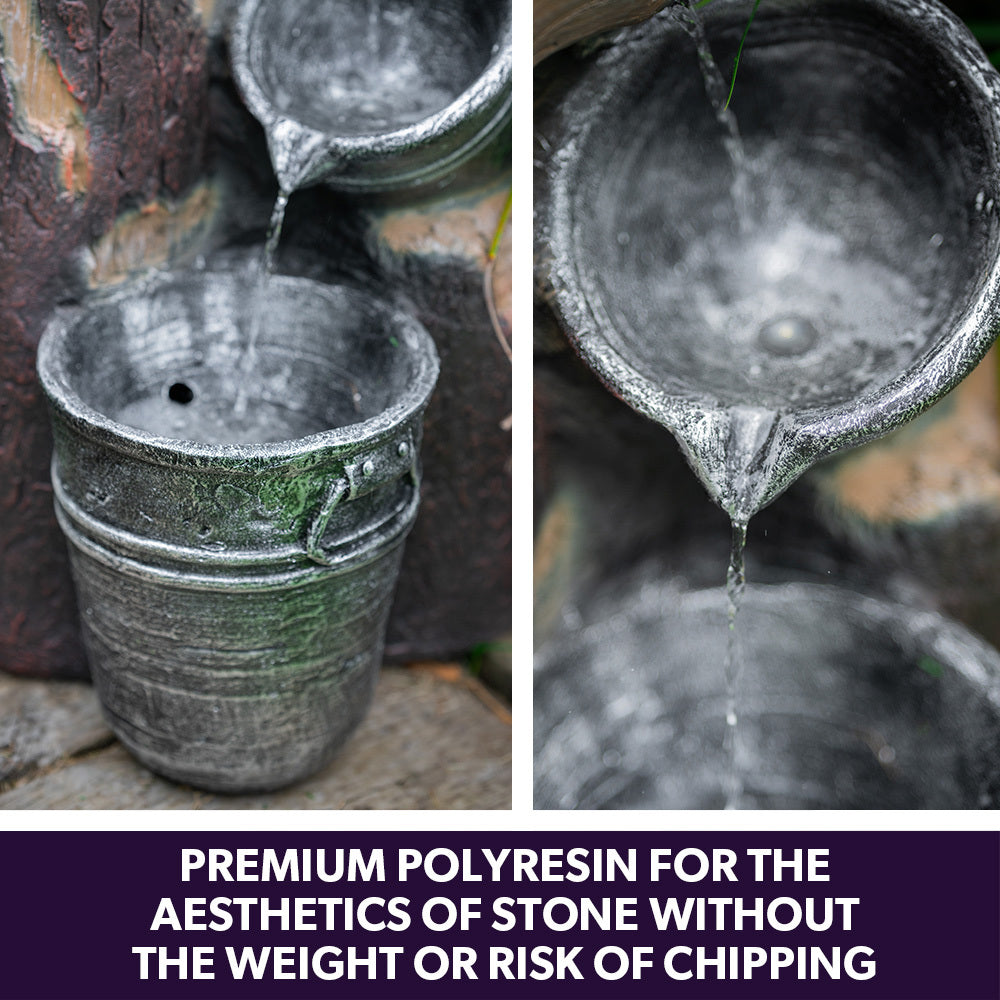 Add an eclectic touch to your garden with this rustic style Cascading Solar Powered Water Feature from PROTEGE. Premium Polyresin craftsmanship offers the aesthetics of metal buckets and wood, without the weight or risk of chipping.