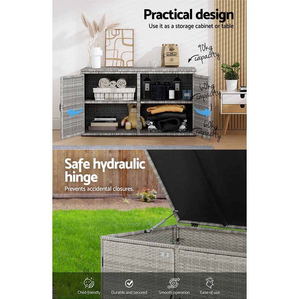 Looking for some extra storage space for your garden or outdoor essentials and tools? Gardeon has you covered with this stylish and versatile Wicker Outdoor Storage Cabinet. The outdoor cabinet is made from durable handwoven wicker that is UV and weather resistant and boasts a strong steel frame with excellent weight capacity of 60kg per shelf and 90kg on the top cover. It has two layers of inner storage space with two different ways of opening. It flaunts a fantastic 2-in-1 design: you can use it as just a storage cabinet, or as a cabinet and side table. It is inherently safe with its wide variety of features including a safe hydraulic hinge, convenient rope handles, durable anti-rust hinges, non-slip foot pads and wall attachments to prevent tipping. Suitable for indoor and outdoor use, you can add style and function to anywhere in the home with a Gardeon Wicker Outdoor Storage Cabinet.