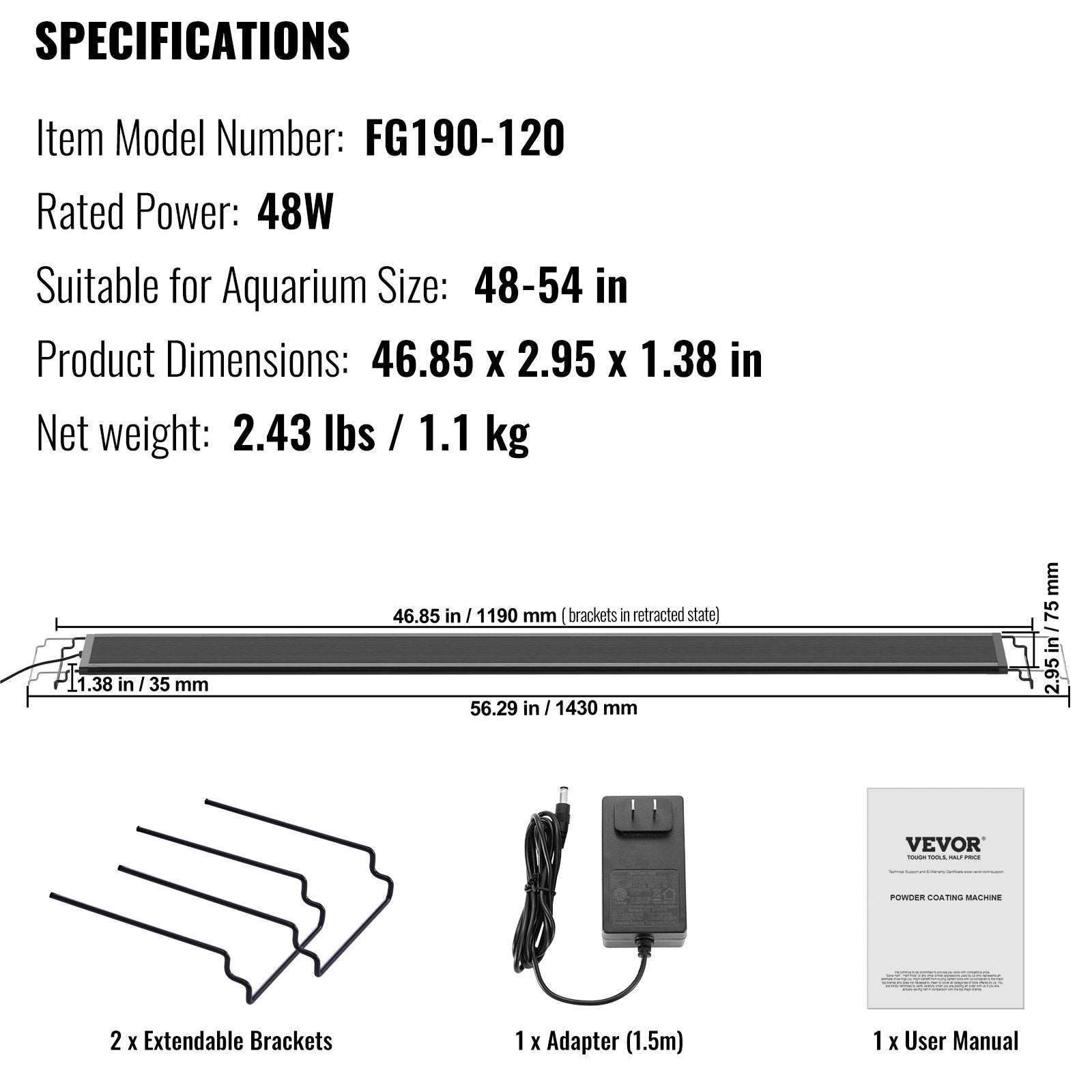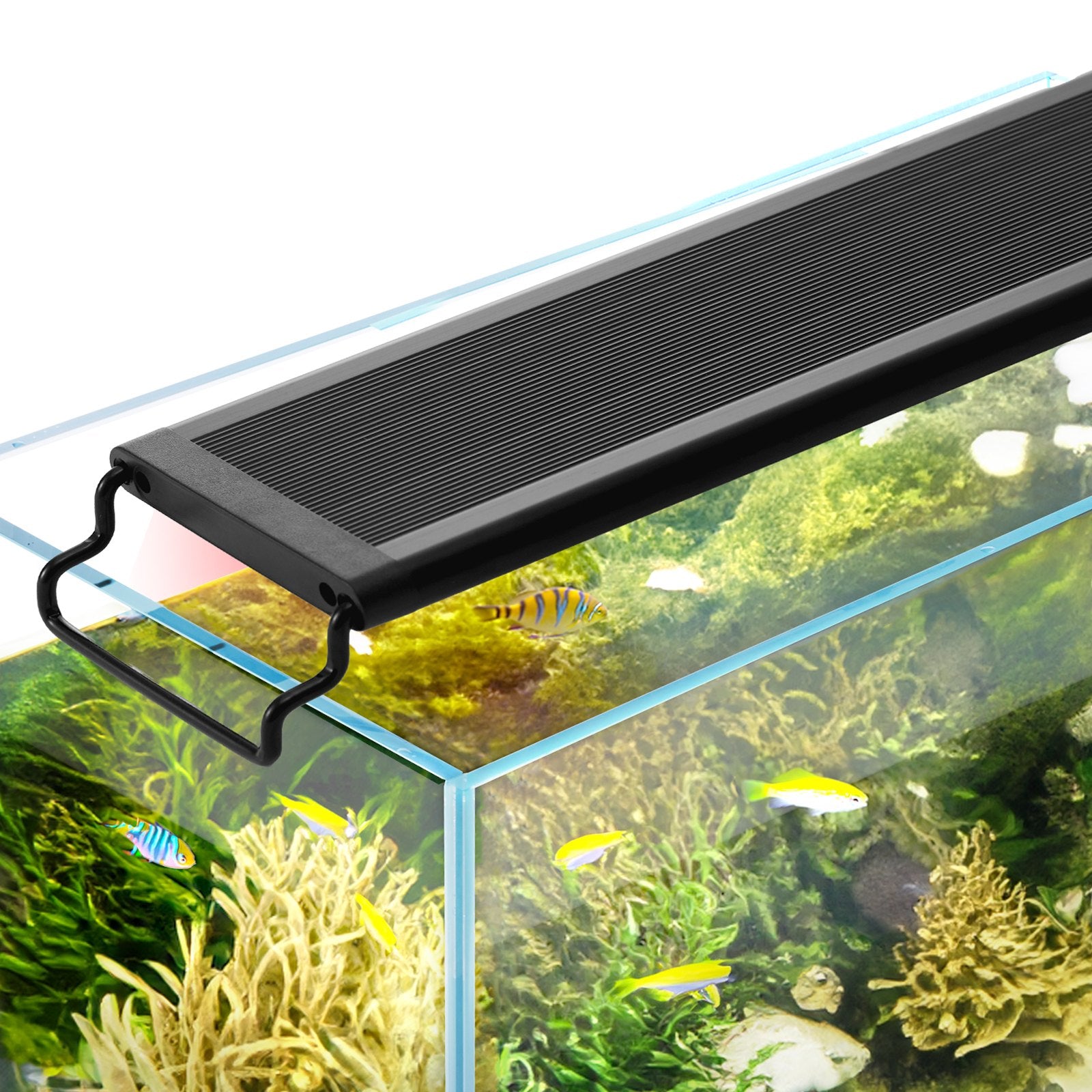 Designed for 48-54 inch aquariums, VEVOR aquarium LED lights have 2 extendable brackets with a maximum single-side extension of 4.7 inch and dual-side extension of 9.45 inch, making them easy to install on most glass or acrylic aquarium tanks with transparent hood/lid or no, with rims or rimless. Suitable for both novice and seasoned aquarium enthusiasts.