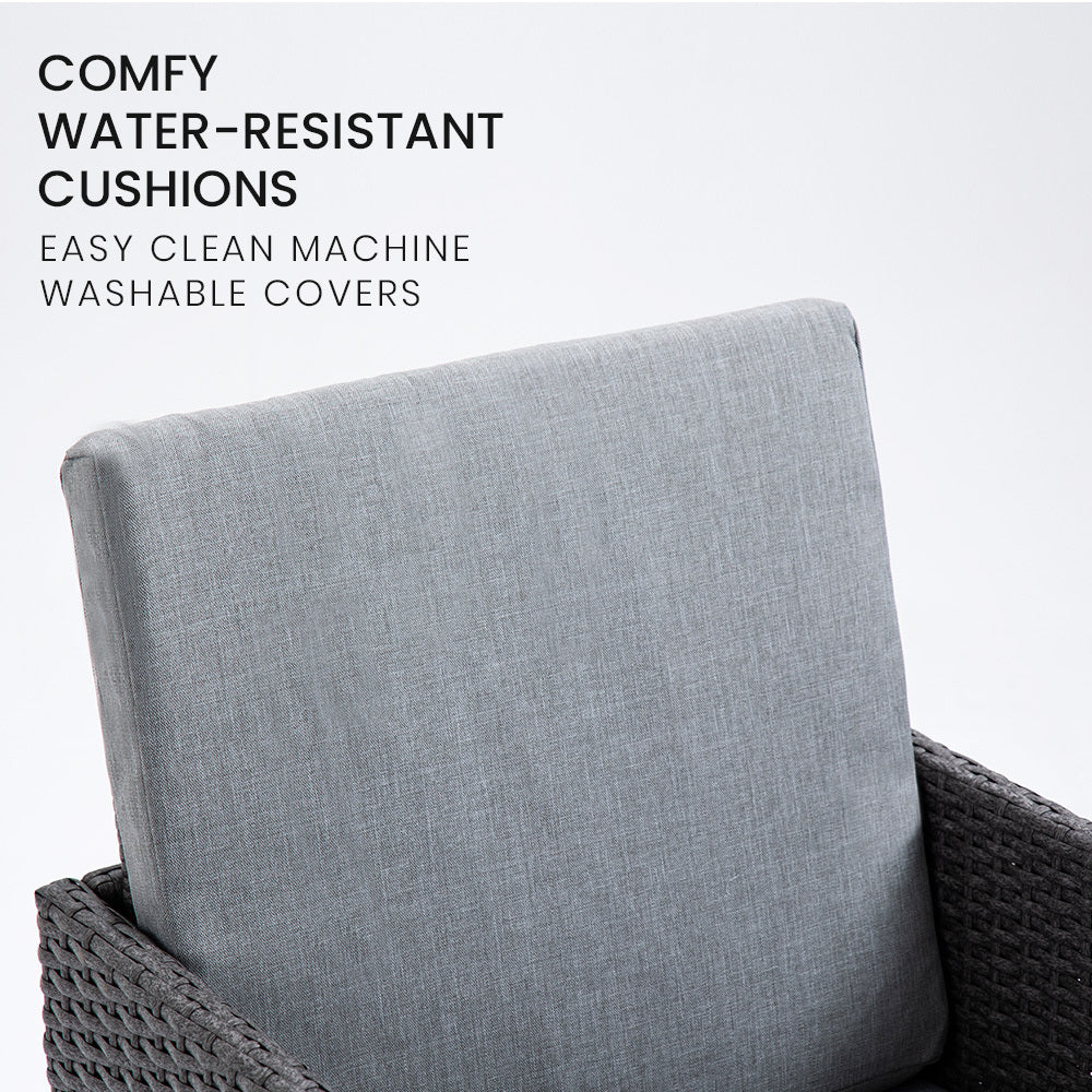 The London Rattan outdoor furniture setting has a durable, rust-resistant powder-coated steel frame and non-marking feet, ensuring no scuffs or rust stains on your outdoor living area.