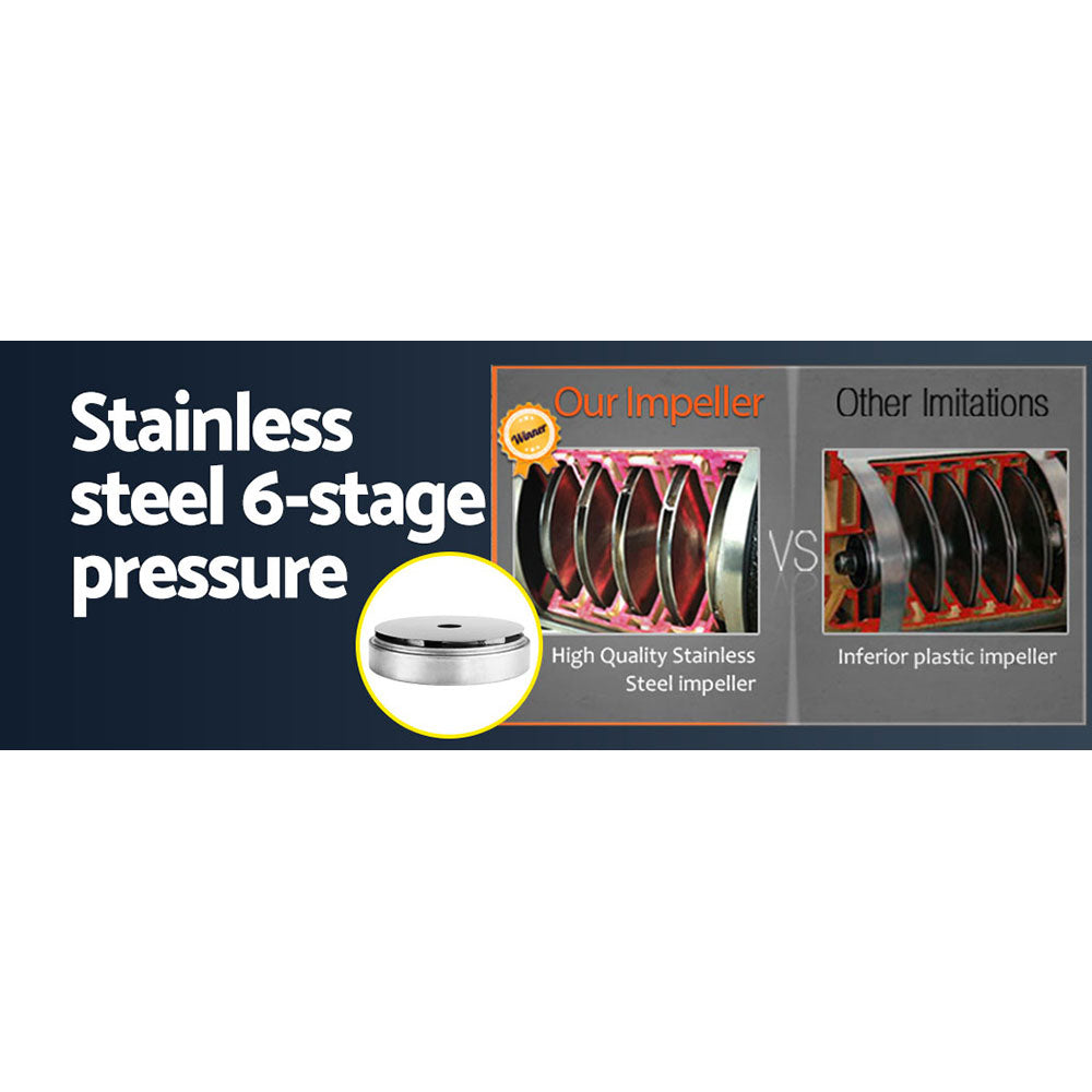 When low water pressure gets you down, power it up with our Giantz 6-stage Water Pump. It is the perfect solution where constant on-demand water pressure is needed at the open and close of any tap. You will find our water pump particularly useful for homes, household gardens, farms, commercial entities or any situation where pressurised water is consistently required. The water pump features an IP-rated commercial motor, full stainless steel pump body, cast iron ends, 1.25‘’ inlet and 1‘’ outlet ports, corrosion-resistant brass connectors, efficient cooling system and not least, built-in thermal protection. Pumping out at a rate of 200L/min with a 70m head, the 2500W water pump can send water up to two stories high effortlessly. You can also accurately control the pressure to your precise requirements with the fully automatic controller and monitor it at a glance of the pressure gauge. Power to the pump is as simple as plugging it straight into any Australian standard socket. Whether you are using the pump as a permanent installation or on an ad hoc basis, you can be assured of dependable and reliable water supply in more ways than one.