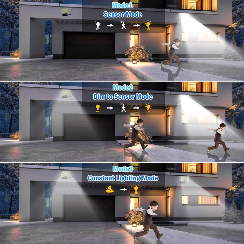 Remote Control Three Lighting Modes: Easily switch modes by remote control or by pressing the button on the back of the solar outdoor light. There are 3 lighting modes that can be chosen according to your needs with this outdoor solar light, it is strong motion detector mode, intelligent motion sensor mode and dusk to dawn mode.