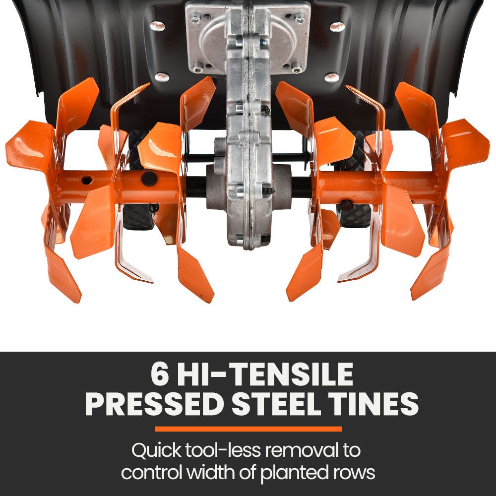 With 26 hi-tensile pressed steel tines you can reach a depth of up to 200mm and a maximum tilling width 400mm (15"), so you'll generally only need one pass to finely mill your soil for better preparation and growth. The blades are removable without the need for tools so that you can adjust the width to suit the planted rows, or to remove roots or debris.