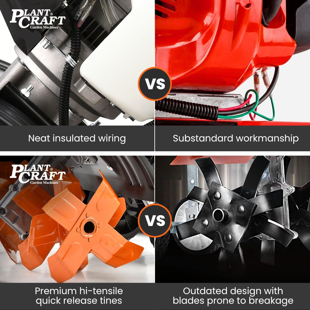 Introducing the Titan 9 from Plantcraft. This 2-in-1 Cultivator and Tiller combination sets itself apart from the many unreliable entry-level models on the market with premium components that offer the easy starting, power, manoeuvrability and longevity that you deserve.