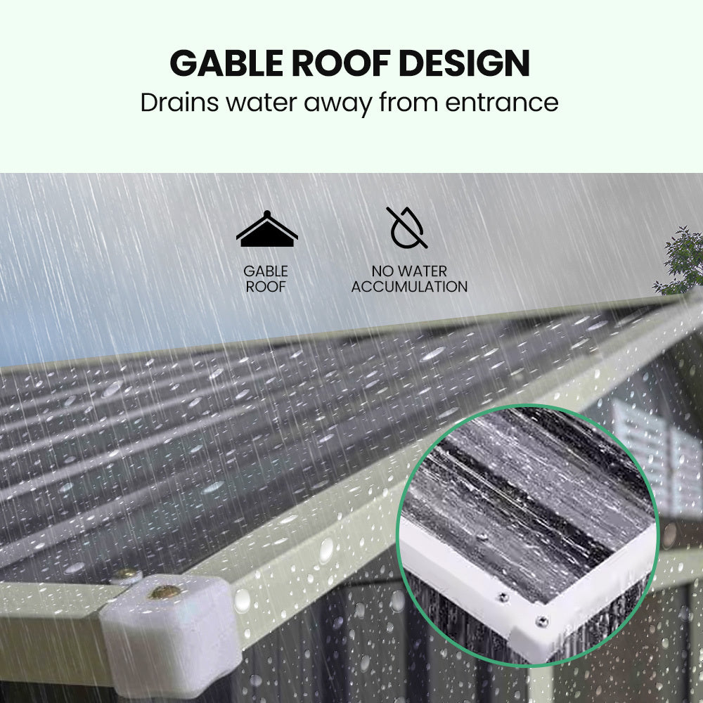 The gable roof design effectively channels water away, keeping the entrance dry. The sliding doors offer smooth operation and include lockable handles, providing an option to secure your belongings (lock not included).