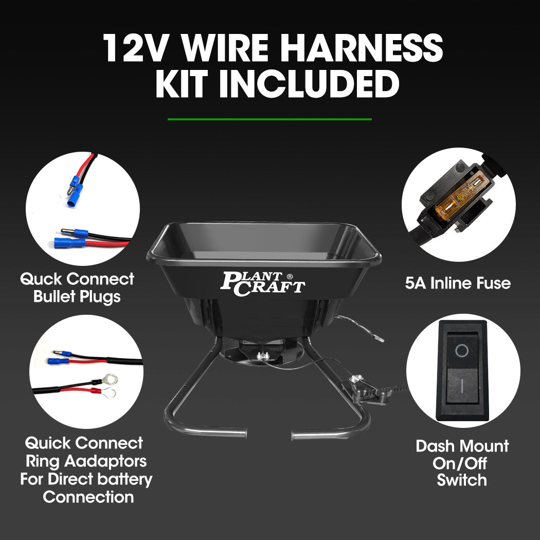 Inside the hopper you’ll find a heat shielded 12V electric motor that spins at a steady 560 RPM for consistent coverage. The motor comes with a quick connect wire harness that has an inline fuse for safety, and an On/Off switch that is pre-wired. You can easily control the output of fertiliser with the flow select lever.