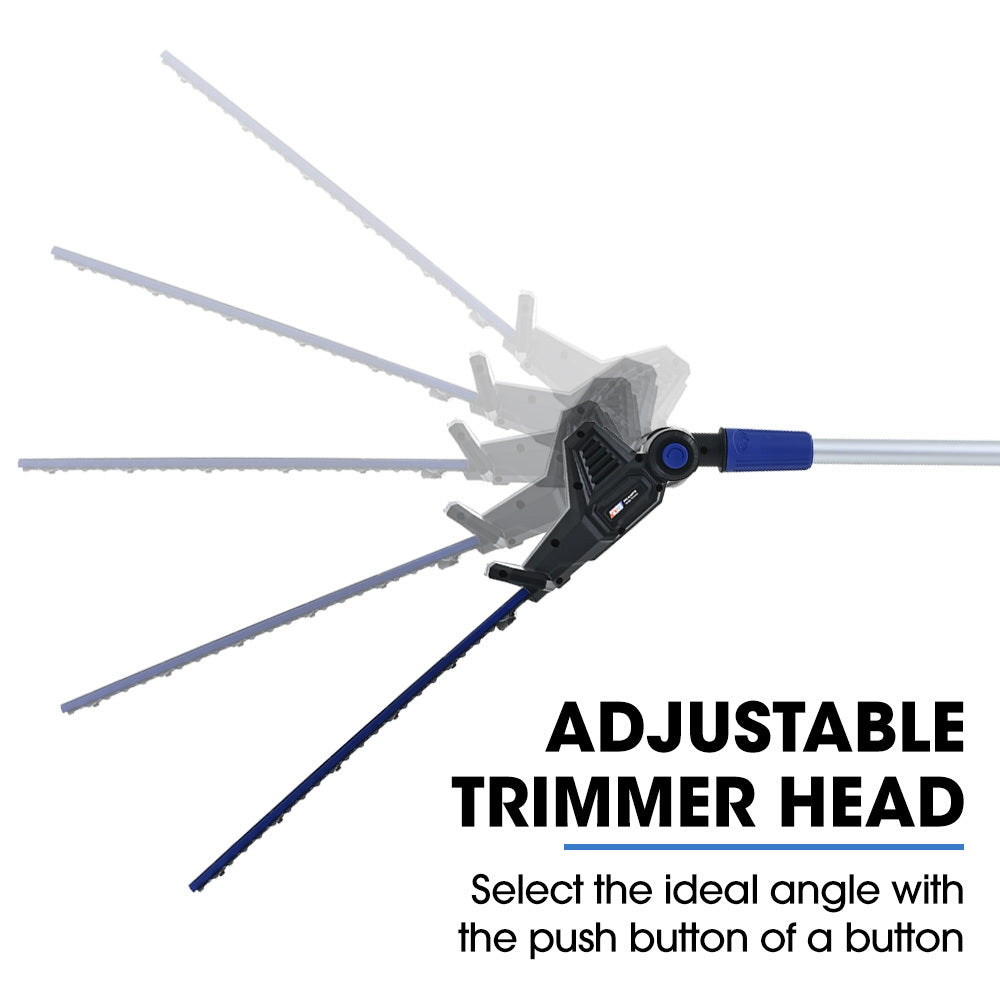 Designed for ultimate flexibility, the interchangeable motorheads allow you to switch from the chainsaw to the hedge trimmer effortlessly. The Pole Hedge Trimmer features a 20' hardened alloy dual-action blade and an adjustable angle head. You can ergonomically trim low box hedges, and with the extension pole fitted you can easily cut at up to 3m.